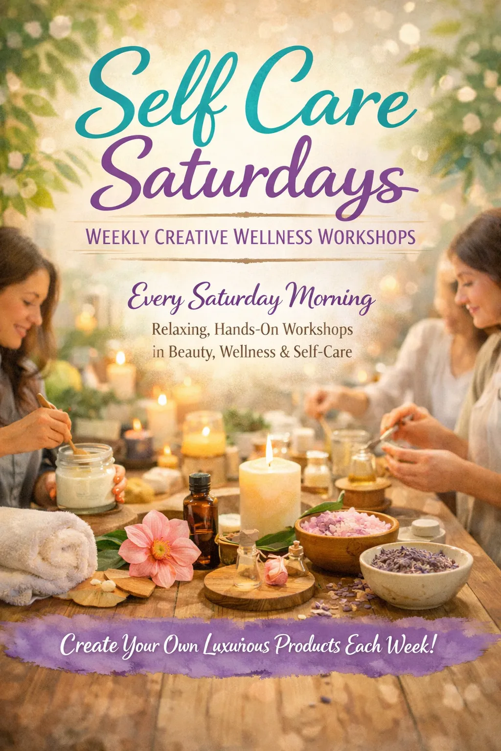 Self Care Saturdays are weekly hands-on workshops where guests create their own beauty, bath, and wellness products in a relaxing and welcoming atmosphere. Each Saturday features a different make-and-take experience designed to help you unwind, explore your creativity, and enjoy a meaningful self-care moment.